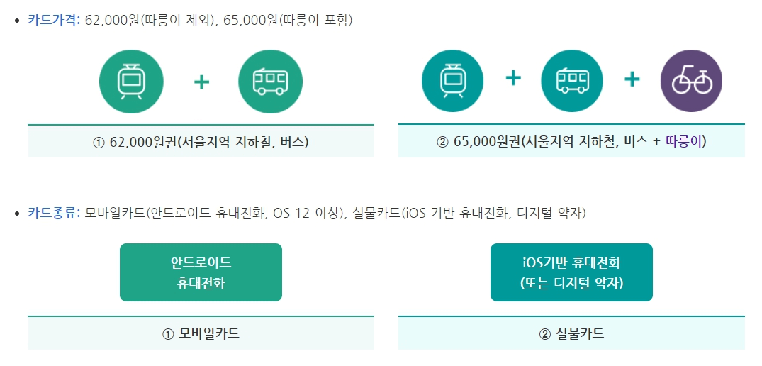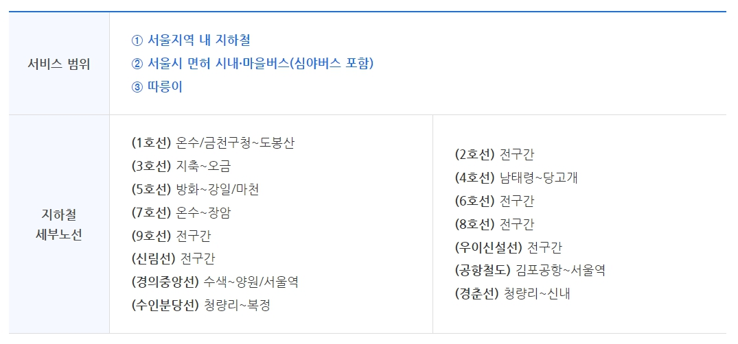 이용범위: 서울지역 지하철, 서울시 면허 시내·마을버스, 따릉이